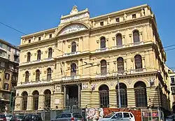 The palace was designed in 1895 by Alfonso Guerra and Luigi Ferrara. Flanking the front steps are two winged genii carrying torches and riding bronze lions. This sculpture by Luigi De Luca was meant as an allegory of the light of reason taming wild force. The main salon has frescoed lunettes by Gustavo Mancinelli, Gaetano Esposito, Vincenzo Migliaro, Alceste Campriani, Salvatore Postiglione, Salvatore Cozzolino, Gaetano d’Agostino, and Giovanni Diana. This salon has stuccoes by Ciro Sannino and Vincenzo Belligiono. In the first floor is a statue by Giuseppe del Fico.[1][2]