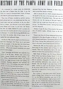 Also known as the "Eagles' Nest of the High Plains," Pampa offered advanced twin-engine training in Beechcraft AT-10 Wichita planes. Also stationed at the field were Curtiss-Wright AT-9, North American B-25 Mitchell, and Cessna AT-17 Bobcat aircraft. During the war, Pampa had a total of 4 satellite fields: