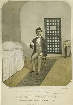 Williamson served 100 days between July 27 and November 3, 1855, in Moyamensing Prison.[6] His case attracted extensive press coverage, as northern publications spread the story throughout the country. "Friends comfortably furnished his cell," where he essentially held court.[9] While imprisoned, he received numerous letters and several hundred visitors, including African-American abolitionists Frederick Douglass and Harriet Tubman, both former slaves who had escaped from the South. These are attested in his visitor book, which is held by the Chester County History Center.[3] Lucretia Mott noted that his imprisonment was extremely helpful to the cause, and said that his father Thomas Williamson was "only afraid Passmore will come out of Prison too soon."[3] supporters of Williamson pressed Judge Kane for his release.