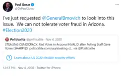 Several weeks after the 2020 presidential election, Gosar was one of 27 Republican members of Congress to request that U.S. Attorney General William Barr "appoint a Special Counsel to investigate irregularities in the 2020 election."[87] The Arizona Republican Party produced a video, featuring Gosar and Representative Andy Biggs, falsely claiming that there was widespread voter fraud in the election. Gosar falsely claimed that Arizona's voting machines were faulty, that Wisconsin intentionally paused counting votes to "dump" 100,000 votes into the count for Joe Biden, and that dead people voted in Pennsylvania. He and Biggs also demanded an audit of Maricopa County's vote count.[88] Gosar strongly objected to counting electoral votes for Biden from certain states.