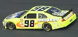 For the 2009 season, Menard moved over to the No. 98 Ford Fusion operated by Yates Racing. Menard showed limited improvement in 2009, running in the top 10 many times, only to later have problems. For example, he crashed at Las Vegas Motor Speedway while running very well, and was involved in a wreck with only 40 laps to go, while running 7th. These issues lead to the team being in danger of falling out of the top 35 in points standings for much of the year. Menard's best finishes included two 13th-place finishes in the Aarons 499 at Talladega Superspeedway as well as the Samsung 500 at Texas Motor Speedway, and a 15th-place finish in the Southern 500. At the second Dover race, Menard started 10th and ran in the top 10 for most of the day, only to find his car tighten up near the end of the race and come home 19th. At the end of the 2009 NASCAR Sprint Cup Series, Menard was the only driver to not score a top 10 finish who ran all of the races. Menard ended up finishing 31st in the final point standings.