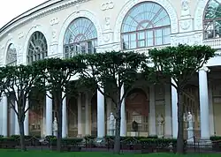 The Gonzago Gallery is a unique architectural and fresco ensemble in the Pavlovsk Palace, created by the Italian decorator, architect and art theorist Pietro di Gottardo Gonzago in the early 19th century. It is the only example in Northern Europe of an exterior fresco painting of such a large area: 350 square metres for the wall and 200 square metres for the ceiling.[20]