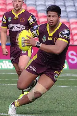 In 2017, he played for the Broncos' NYC team.[19] After impressing for the Broncos NYC side throughout the year, he was called in to act as an Andrew Fifita "clone" at a Queensland State of Origin opposed training session before game three of the 2017 series.[20] In September 2017, he was named at prop in the NYC Team of the Year.[21]