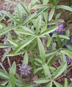 It has an inflorescence on stems 5-6 centimeters long, separate from the leaves, arising from a subterranean stem and deep carrot-shaped root that is 3–7 cm long. The long petioled leaves are palmately divided into 5 linear-elliptic leaflets that are 3-5 centimeters long. The flowers, borne in condensed spikes separate from the leaves, are purple and pea-like, and have a surprisingly strong scent, reminiscent of lemon furniture polish. The species has edible tuberous roots, high in protein.
