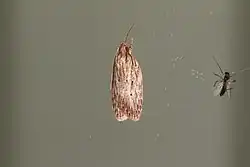 The wingspan is 18–23 mm. The forewings are fuscous, sometimes reddish tinged, sprinkled with dark fuscous. The anterior half is more or less mixed with ochreous whitish. The stigmata are indistinct and dark fuscous, the plical beneath the first discal and there is a thick cloudy dentate angulated ochreous-whitish subterminal line, near and parallel to the posterior half of the costa and termen. There is a terminal series of dark spots. The hindwings are light grey, paler towards the base.[2]