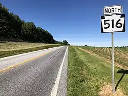Pennsylvania Route 516 (PA 516) is a 12.5-mile-long (20.1 km) state highway located in York County, Pennsylvania. The southern terminus is the Maryland state line in Manheim Township, where the road continues into that state as Maryland Route 86 (MD 86). The northern terminus is at PA 116 in Spring Grove. PA 516 is a two-lane undivided road that passes through rural areas in southwestern York County. The route heads northeast from the state line to Sticks, where it turns north and intersects the western terminus of PA 851 and crosses PA 216. PA 516 heads northwest and passes through Jefferson before it reaches its northern terminus.