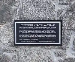 The St. Austell and Pentewan Railway, made about 50 years ago, was for the conveyance of goods only. It was intended, recently, to work it by locomotives, but the opposition of Mr. Hawkins, a landowner, prevented it. Its chief use is for the conveyance of china clay to Pentewan.[6]