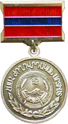 People's Artist of the Armenian SSR (Народный артист Армянской ССР), is an honorary title awarded to citizens of the Armenian SSR in the Soviet Union. It is awarded for outstanding performance in the performing arts, whose merits are exceptional in the sphere of the development of the performing arts (theatre, music, dance, circus, cinema, etc.).