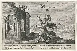 Daedalus was so envious of his nephew's accomplishments that he took an opportunity, when they were together one day on the top of a high tower, to push him off, but Athena, who favors ingenuity, saw him falling and arrested his fate by changing him into a bird called after his name, the perdix (partridge). This bird does not build its nest in the trees, nor take lofty flights, but nestles in the hedges, and mindful of his fall, avoids high places. For this crime, Daedalus was tried and banished.[3] In some accounts, Athena leaves Daedalus with a scar in the shape of a partridge, to remind him of what he did.