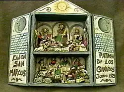The precursors of the retablo ayacuchano bore such names as misa, demanda, missa mastay or cajón San Marcos ("St. Mark's box or drawer").[14] Although the "St. Mark's box" name has been used as shorthand to denote all the precursors,[14] the name used in Colonial times was the demanda, carried by itinerant priests and doctrineros.[18] The priests may have initially brought the prop from Spain,[19] perhaps using the portable shrines or "boxes" (cajas) of the santero, a person who solicits alms in the name of a saint.[20] (Confusingly santero is also one of the obsolete names for a retablo (sanmarco) maker.[12][b]