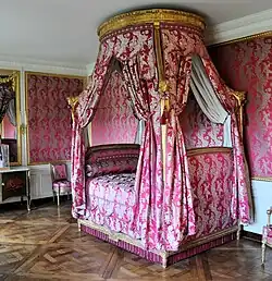 Within the Queen's apartment, the décor of her boudoir features mirrored panels that, by the turning of a crank, can be raised or lowered to obscure the windows and reflect the candlelight. Her bedroom was provided with furniture from Georges Jacob and Jean Henri Riesener. Jacob designed a set of furniture for the room known as the mobilier aux épis, elaborately carved with flowers, which Marie Antoinette was greatly fond of, and garlands. It was upholstered in embroidered Lyon silk.[7] The wallpaper was painted by Jean-Baptiste Pillement.