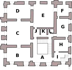 The ground floor, which is only accessible from the south and east sides due to the sloping ground, essentially houses the outbuildings. The terraces make it possible to conceal the passageways needed to service the Petit Trianon and in particular the connections with the ancillary buildings, such as the theatre and chapel.[61] The first floor contains the reception rooms and the Queen's apartments. The King's chambers and the guests' rooms were located in the attic. The 'noble floor' is accessed directly from the porch. Seemingly open onto the gardens, the drawing room floor is located above a ground floor that overlooks, on the Versailles side, the small rectangular cour d'honneur rounded at the corners,[65] redesigned in Marie Antoinette's time, framed by a small wall and a hedge of hornbeams and closed by a soft green gate flanked by two sentry boxes.[66] Opposite is the avenue du Petit Trianon, which leads to the château de Versailles.