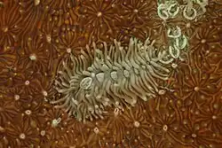 | Phestilla viei laying a distinctive linear trail of crescent-shaped egg masses on its host coral Pavona explanulata | |