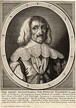 Philip Herbert, 4th Earl of Pembroke and 1st Earl of Montgomery, KG, KB, PC (10 October 1584 – 23 January 1650)[1] was an English courtier, nobleman, and politician active during the reigns of James I and Charles I.[1][2] He married Susan de Vere, the youngest daughter of Edward de Vere, 17th Earl of Oxford, the Oxfordians' William Shakespeare. Philip and his older brother William were the 'incomparable pair of brethren' to whom the First Folio of Shakespeare's collected works was dedicated in 1623.