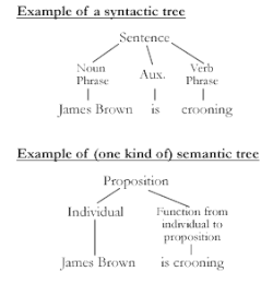 Linguists have developed at least two general methods of understanding the relationship between the parts of a linguistic string and how it is put together: syntactic and semantic trees. Syntactic trees draw upon the words of a sentence with the grammar of the sentence in mind; semantic trees focus upon the role of the meaning of the words and how those meanings combine to provide insight onto the genesis of semantic facts.