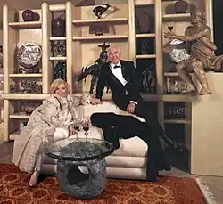 In addition to designing furniture for residences in Los Angeles and around the country, Morris enjoyed creating pieces for high-roller suites in Las Vegas, Nevada where her opulent style was a perfect match. Her interiors for the Imperial Suite at the International Hotel built by mega-developer Kirk Kerkorian cost more than $200,000 to furnish, a handsome sum for 1970. A columnist reported in the Chicago Tribune that helicopters were needed to airlift Morris' massively-scaled furniture through the penthouse windows. "She's tops in this town," said writer Norma Lee Browning about Morris.[7] The first occupant of this 6,000-square-foot (560 m2) suite was Frank Sinatra, followed by Jackie and Aristotle Onassis for whom the space was originally designed. Morris always wondered what the former First Lady and the Greek shipping tycoon thought of the fur rugs she used throughout. Morris also provided furnishings for Elvis Presley's 4,000-square-foot (370 m2) suite at the Las Vegas Hilton in the mid-1970s with its black carpeting and furniture upholstered in white and yellow silk. "We had to redo his sofas twice a year," Morris told the Houston Chronicle. "He didn't care if he damaged the room, but he didn't want anybody else hurting things. And there were always white and yellow orchids."[8]