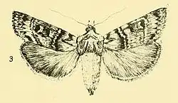 Expanse. 28 to 30 lines. Antennae ferruginous-grey, filiform. Legs, palpi, head, and thorax grey irrorated with ferruginous. A dark mark across front of thoracic crest. Crests strong. Abdomen greyish-ochreous, lighter in colour towards anal tuft, which is light ochreous-grey. Forewings grey, markings ferruginous. Reniform and orbicular grey out-lined with ferruginous. Base of wing light grey, followed by a dark jagged transverse line. A double jagged transverse line at 1⁄4 across wing. A suffused patch around reniform, continuing as a well-defined jagged line with a faint line on each side to dorsum. A rather indistinct suffused line near termen. Cilia grey. Hindwings uniform dark-grey. Cilia silvery-grey with a dark-grey line at base.[2]