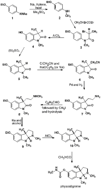 Physostigmine has two stereocenters—the two carbons where the five-membered rings join—so any attempt at the total synthesis must pay attention to obtaining the correct stereoisomer. The 71 syntheses of physostigmine yield 33 racemic mixtures and 38 products of a single enantiomer. The first total synthesis of physostigmine was achieved by Julian and Pikl in 1935.[18] The main goal of Julian's formal physostigmine synthesis was to prepare the key compound (L)-eseroline (compound 10 in the adjacent diagram), the conversion of which to physostigmine would be straightforward. In one of his earlier works[19] Julian synthesized the ring of physostigmine from 1-methyl-3-formyl-oxindole as starting material, which was discovered by Paul Friedländer. However, the starting material was expensive, and the reduction of a nitrile to an amine (similar to the reaction of compound 6 to give compound 7 in the diagram) with sodium and alcohol did not proceed in good yield. In his second work “Studies in the Indole Series III,” he had improved the yield of amine from nitrile significantly by using palladium and hydrogen. Although he succeeded in the synthesis of the target compound, the route had several drawbacks. First, the chemical resolution of compound 8 is unreliable, and the chemical resolution of ''rac''-eserethole gives optically pure product only after eight recrystallizations of its tartrate salt. Second, the reductive amination going from compound 8 to compound 9 requires a large amount of Na. In the years since this initial work, many other groups have used a variety of approaches to construct the ring system and showcase new synthetic methods.