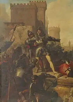 The construction phases of the Palazzo della Loggia are very complex and linked to the historical and political events of the time. It is no coincidence that, at the end of the first decade of the century, the political climate in Europe became increasingly tense: the events of the War of the League of Cambrai were imminent, and the first French incursions into Brescia can be interpreted as a sign of a process that was coming to an end. In a few years, the sack of Brescia in 1512 by French troops under the command of Gaston of Foix would not only devastate the city, but also destroy the myth of the so-called Brixia magnipotens.[note 4] The great Renaissance construction sites of the city came to a halt, including that of the Palazzo della Loggia, which still had, at the base of the scaffolding, many reliefs by Gasparo Cairano ready to be installed on the fronts of the second floor, including the two angular trophies, which remained there for a period of fifty years, waiting for the resumption of work under the direction of Lodovico Beretta, precisely in 1549–1550.[37][38] The city's priorities changed radically, from artistic and cultural splendor to the recovery of basic vital functions;[39] the building of the Loggia was not completed until 1574, almost a century after the start of construction.