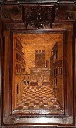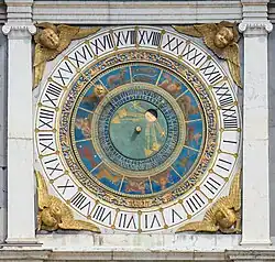 Having finished the western portion of the square with the erection of the aforementioned loggia, they proceeded by erecting in 1437, this time on the eastern side, a first turret equipped with a clock.[11] It again consisted of a loggia structure designed by architect Lodovico Beretta, designed so that it rested directly on the fortified walls of the New Citadel.[13] Later a first clock, placed on the same turret, was completed in 1447 and decorated not only with the coats of arms of the rulers and the city, but also with two statues sculpted by Andriolo Vigevano depicting Mary and the archangel Gabriel.[13] The same clock face was probably modified when the eastern porticoes of the square were built, as testified by a wooden inlay in the choir of the Church of Saints Bartholomew and Stephen in Bergamo, which is useful for tracing at least a partial reconstruction of the 15th century core of the Brescian square.[11]
