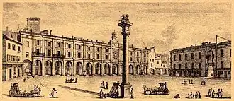 The city council, after decorating the west and east sides, therefore decided to erect in 1465 a wall of carved stones in the southern portion of the square, so that it would serve as a support to erect an eventual palace there in the future.[11][14] However, two unexpected events prompted the municipal authorities to change what had been previously planned: in carrying out the demolition work on the houses in that portion of the square,[note 2] “certain beautiful ancient stones with epitaphs and beautiful ancient writings,”[15] that is, marbles and epigraphs from the Roman age, as reported by the chronicler Iacopo Melga in his chronicle, were found underground.[11][16] Another factor of some importance was the burning, in the same area, of some huts and woodworking shops, which caught fire as a result of the celebrations desired by the population for the peace of Bagnolo in 1484.[11][17]