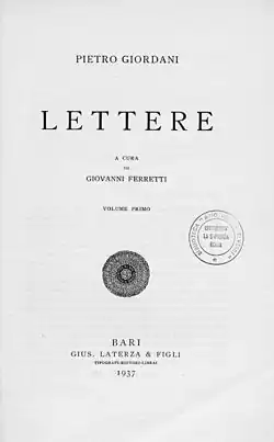 2. ^ Maria Paola Macioci. "Chi era Pietro Giordani, lo scrittore piacentino che fu amico di Giacomo Leopardi". SoloLibri.net (in Italian). Retrieved 2025-01-18.