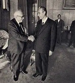 In the early 1960s, Nenni facilitated an "opening to the centre-left" enabling coalition governments between the PSI and the Christian Democrats and leading the socialists back into office for the first time since 1947.[7] He formed a centre-left coalition with Saragat, Aldo Moro and Ugo La Malfa, and favored a reunion with the PSDI. From 1963 to 1968 he was Deputy Prime Minister in the three successive governments led by Moro and in December 1968 he became Minister for Foreign Affairs in the first government of Mariano Rumor, but resigned in July 1969, when the center-left alliance collapsed.