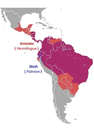 The order Pilosa /pˈlsə/ is a clade of xenarthran placental mammals, native to the Americas. It includes anteaters and sloths (which include the extinct ground sloths). The name comes from the Latin word for "hairy".[2]