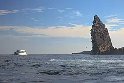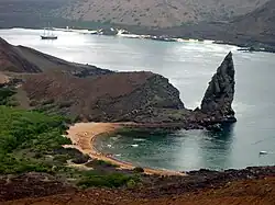 Pinnacle Rock (Spanish: Roca del Pináculo) is a celebrated volcanic plug on Bartolomé Island, one of Ecuador's Galápagos Islands.[1][2] It is beside Sulivan Bay, part of a channel that separates Bartolomé from nearby Santiago Island. The rock is part of a now largely eroded volcanic dike that once connected the two islands. Several endemic species of lichen in the genus Ramalina have been found on Pinnacle Rock.[3]