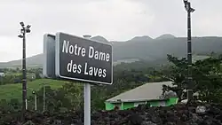 In April 1977, Piton Sainte-Rose was devastated by a lava flow from the Piton de la Fournaise, the active volcano of the island.[1] The village church was partly invaded by the lava flow but not destroyed.[2] The church was subsequently restored and renamed Notre Dame des Laves (Our Lady of the Lava). It is used for Catholic services.[3]