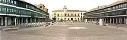 Plaza Mayor de Almagro is a town square located in the city of Almagro, Castile-La Mancha, Spain. Amalgro is designated a conjunto histórico (a heritage listing), and the square is of architectural interest. It is the location of the city hall and a historic theatre, the Corral de comedias de Almagro. Amalgro is a name of Arabic origin (المغرة , al-magra) referring to the local red clay, which is one of the materials used in the plaza mayor. Probably the settlement began as a small Muslim castle, possibly on the site now occupied by the hermitage of San Juan. The fief was bestowed on Gonzalo Yáñez de Noboa, ninth Grand Master of the Order of Calatrava, after the Battle of the Navas de Tolosa, and the grant was confirmed by Ferdinand III in 1222.[1] Amalgro became an important centre for the Order of Calatrava and the area which became known as Campo de Calatrava.[2]