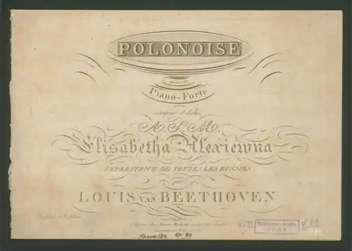The Polonaise in C major, Op. 89, by Ludwig van Beethoven is a polonaise for solo piano, published in 1815. He composed it in December 1814, at a time when the polonaise was becoming a popular dance and class marker among the European nobility.[1] Beethoven was presented as a prominent artist at the ongoing Congress of Vienna,[2] where he met the visiting Russian Empress Elizabeth Alexeievna. He dedicated the polonaise to the Empress, and was compensated with a sum of 50 ducats.[3] The piece is Beethoven's first and only published standalone polonaise, and is notable as a precursor to Chopin's more well-known polonaises.[4]