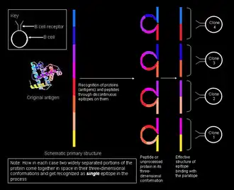 - ^ Here, intact implies that the undigested protein is recognized, and not that the paratope on B cell receptor comes in contact with the whole protein structure at the same time; the paratope will still contact only a restricted portion of the antigen exposed on its surface.