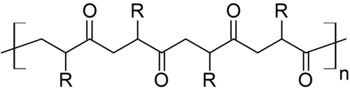 General chemical structure of a polyketone. In practice, R is usually H.