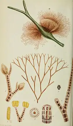 The life history is a sequence of three phases: gametangial, carposporangial and tetrasporangial. Two of the phases are similar.[6] The plants are dioecious with spermatangial branches produced in tufts at the apices of the branches.[2] The cystocarps are borne, usually singly.[7] with a narrow ostiole from which carpospores are released. The tetraspores occur in spiral series[2] resulting from a simultaneous division into 4 equal spores.[8]