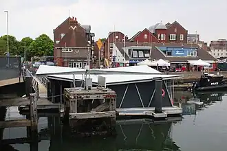 The crew facilities and storeroom occupies one part of a larger brick-built building facing the water on Poole Quay. The upper floor is set into the roof with a large window overlooking the lifeboat's pontoon. The boathouse for the ILB is moored alongside this pontoon adjacent to the Lifting Bridge.