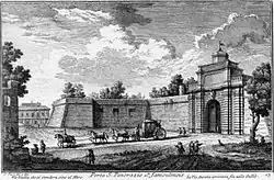 One of the relevant characteristics of the 14th Region, where the gate rose, was that Via Aurelia vetus passed through it: the street started from Pons Aemilius, climbed the hill and exited from the town just through the gate, that took its name from the street (even now, the present Via Aurelia Antica, having lost its stretch within Trastevere, starts here). For this reason, the former name of the gate was Porta Aurelia,[1] though the denominations "Gianicolense" or "Aureliana" – from the name of the consul that conceived and built the road – are attested. The importance of the near sepulchre of the Christian martyr Pancras, of the catacomb consecrated to him and later of the Basilica, destinations of continual pilgrimages, became so much prevalent along the consular street, as to influence, just like in many other cases, the process of Christianization of the nomenclature of the Roman gates, and since the 6th century the gate was bestowed the name it maintains to this day.[2]