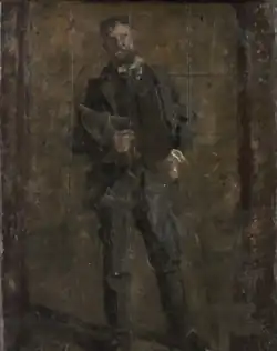 The Pennsylvania Museum and School of Industrial Art (PMSIA) had been chartered in 1876, and was housed in Memorial Hall, the art gallery from the 1876 Centennial Exposition. The school began classes in Fall 1877, in a building at 312 North Broad Street,[1] and soon expanded into the old Franklin Institute (now the Philadelphia History Museum), at 15 South 7th Street.[2] Miller came to Philadelphia in Summer 1880 as PMSIA's first principal,[2] at the same time that Eakins was teaching at the Pennsylvania Academy of the Fine Arts. Miller registered for PAFA's life classes in February 1881.[3] Colleagues in Philadelphia's artistic circles, Eakins and Miller became close friends. Miller was a member of the American Philosophical Society, the Historical Society of Pennsylvania, and was a founder of the Art Club of Philadelphia. As secretary of the Fairmount Park Art Association (1900–20), he was involved in public art decisions for the City, including the layout of the Benjamin Franklin Parkway and the design of the Philadelphia Museum of Art. He was an honorary member of Philadelphia's T-Square Club, and of the Philadelphia chapter of the American Institute of Architects.