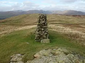 Potter Fell is made up of four separate peaks (as identified by Wainwright), two of which are unnamed. The first unnamed summit (395 m / 1,296 ft)[3] lies between Potter Tarn and Brunt Knott.[4] Further north from the first unnamed summit is Brunt Knott (427 m / 1,401 ft),[5] marked by a stone triangulation station at its highest point.[6] Between these first two summits is a small pool of water with a wall running through it, which Wainwright named "wall through a pool".[6] East of these two summits is another unnamed one (390 m / 1,280 ft).[7][4] Further east is the fourth summit, Ulgraves (332 m / 1,089 ft);[8][9] like Brunt Knott, the highest point is marked by a trig point. The summit of Ulgraves looks over the Longsleddale valley.[10]