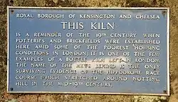 Pottery Lane is a street in Notting Hill, west London. Today it forms part of one of London's most fashionable and expensive neighbourhoods, but in the mid-19th century it lay at the heart of a wretched and notorious slum known as the "Potteries and the Piggeries". The slum came to the attention of Londoners with the building of the Hippodrome in 1837 by entrepreneur John Whyte. Unfortunately for Whyte a public right of way existed over his land and "dirty and dissolute vagabonds" from the nearby slum invaded his racecourse, adding to his financial difficulties and, in part, leading to the closure of his venture in 1842. Pottery Lane gradually improved in the late 20th century along with the rest of the Notting Hill area, and today the houses there fetch multi-million pound prices. Just one of the original brick kilns still survives; it is located in Walmer Road, just north of Pottery Lane, and bears a commemorative plaque placed there by the Royal Borough of Kensington and Chelsea.