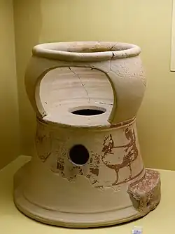 Potty chairs have been used to toilet train toddlers as far back as sixth-century ancient Greece; a clay potty chair from that time period was once discovered in the Ancient Agora of Athens, and potty chair images can be seen in red figure pottery iconography.[4][5]