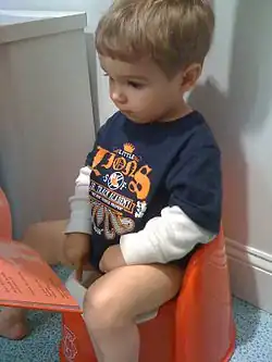 A potty chair, or simply a potty, is a proportionately small chair or enclosure with an opening for seating very young children in order for them to urinate and defecate ("go potty").[1][2] Potty chairs are a variant of the close stool, which were commonly used by adults before the widespread adoption of water flush toilets. There are a variety of potty chair designs. One type of potty chair, placed directly over the toilet, is called a "toilet training deat" and allows ejected fecal material from a young child to drop directly into the toilet bowl, therefore eliminating manual removal and disposal of the said waste from a receptacle beneath the hole, which is often a bag or receptacle similar to a chamber pot. Potty chairs are typically used during the potty training, also known as toilet training, of toddlers.