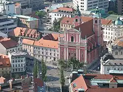Prešeren Square gained its current appearance in the 17th century, when the baroque-style Franciscan Church of the Annunciation was built and was first known as St. Mary's Square after the church.[2] In the 19th century, the crossroad was changed into a square and paved.[6] After the 1895 Ljubljana earthquake, architect Max Fabiani designed the square as the hub of four streets. In place of the medieval houses which were damaged by the earthquake, a number of palaces were built around it. Between Wolf Street and Čop Street stands the Hauptmann House, built in 1873 and renovated in 1904 in the Secessionist style by the architect Ciril Metod Koch. The other palaces include the Frisch House, the Seunig House and the Urbanc House, as well as the Mayer department store, built thirty years later.[6]