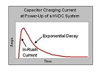 Inrush currents into capacitive components are a key concern in power-up stress to components. When DC input power is applied to a capacitive load, the step response of the voltage input will cause the input capacitor to charge. The capacitor charging starts with an inrush current and ends with an exponential decay down to the steady state condition. When the magnitude of the inrush peak is very large compared to the maximum rating of the components, then component stress is to be expected. The current into a capacitor is known to be : the peak inrush current will depend upon the capacitance C and the rate of change of the voltage (dV/dT). The inrush current will increase as the capacitance value increases, and the inrush current will increase as the voltage of the power source increases. This second parameter is of primary concern in high voltage power distribution systems. By their nature, high voltage power sources will deliver high voltage into the distribution system. Capacitive loads will then be subject to high inrush currents upon power-up. The stress to the components must be understood and minimized.