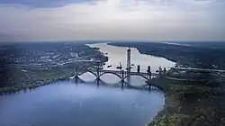 The Preobrazhensky Bridge is a two bridge crossing over the Dnipro River in the city of Zaporizhzhia, Ukraine. Construction on the bridges began in the spring of 1949 and was completed in 1952. The official opening took place on December 31, 1952.[1] Due to the lack of high-tech steel in the early post-war years, the bridges were built from reinforced concrete. The bridges are named after the engineer Borys Preobrazhenskyi. The railway and highway which run over the bridge connect the Khortytskyi District with the Zaporizhzhia city center.[2]