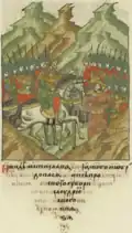 Rogvold, a non-Rurikid Varangian, was the first Prince of Polotsk. When Vladimir the Great returned from exile in Scandinavia in 980 to try to claim the Kievan throne that his brother, Yaropolk, held, he sought an alliance with Rogvolod through a marriage with his daughter, Rogneda. When she refused, calling Vladimir the "son of a slave," he attacked Polotsk, killed Rogvold and his son, and took Rogneda by force to be his wife.[1] Polotsk was then granted to Vladimir's son, Izyaslav, around the time of Christianization (988), and when Izyaslav predeceased his father in 1001, the throne of Polotsk was passed on to Izyaslav's son, Briacheslav, and the Polotsk line (the senior branch of Vladimir's sons) became izgoi and was not legally allowed to succeed to the Kievan throne,[2] although Bryacheslav's son, Vseslav, held briefly the Kievan throne in 1068–1069, after it was granted to him by the veche following the Kiev Uprising.[3]