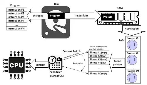 In computing, a process is the instance of a computer program that is being executed by one or many threads. There are many different process models, some of which are light weight, but almost all processes (even entire virtual machines) are rooted in an operating system (OS) process which comprises the program code, assigned system resources, physical and logical access permissions, and data structures to initiate, control and coordinate execution activity. Depending on the OS, a process may be made up of multiple threads of execution that execute instructions concurrently.[1][2]