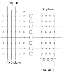 A programmable logic array (PLA) is a kind of programmable logic device used to implement combinational logic circuits. The PLA has a set of programmable AND gate planes, which link to a set of programmable OR gate planes, which can then be conditionally complemented to produce an output. It has 2N AND gates for N input variables, and for M outputs from the PLA, there should be M OR gates, each with programmable inputs from all of the AND gates. This layout allows for many logic functions to be synthesized in the sum of products canonical forms.