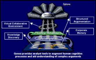 The program was designed to support both top-down and bottom-up approaches; a policy maker could hypothesize a possible attack and use Genoa to look for supporting evidence of such a plot, or it would compile pieces of intelligence into a diagram and suggest possible outcomes. Human analysts would then be able to modify the diagram to test various cases.[2]