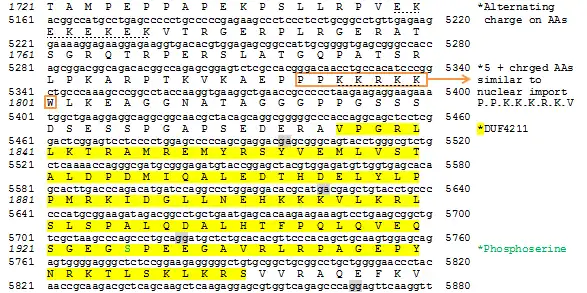 The PRR12 transcript encodes a protein that is 2036 residues long. It has a molecular weight of 211.1 kdal and an isoelectric point around 7.728.[15] A number of bioinformatics databases have also predicted PRR12 to be a soluble protein with no transmembrane domains.[15][16][17] Jianping Chen lists PRR12 as an "extremely vulnerable protein".[18] These proteins have regions rich in amino acids that are "poor protectors" of hydrogen bonds along the backbone of the protein, inhibiting the ability of these proteins to fold properly and allowing the possibility of protein aggregation. Residues such as G, A, S, Y, and P are listed as poor protectors and PRR12 is rich in both proline and glycine.[15][18] Many of the proline residues are positioned consecutively in regions of low complexity. These regions may give this protein interesting secondary structure as a cluster of proline can form a polyproline helix.[19] PRR12 contains a possible nuclear import signal starting at P1794. A typical nuclear localization sequence would have the following residues: P-P-K-K-K-R-K-V.[20] PRR12 contains a DUF4211 domain starting at V1836 that shows homology to the pfam13926 domain.[21] This domain is well conserved in PRR12 orthologs. PRR12 also contains well conserved AT-hook binding regions at P1168 and G1202. These regions allow proteins to bind DNA, further supporting the localization of PRR12 to the nucleus.